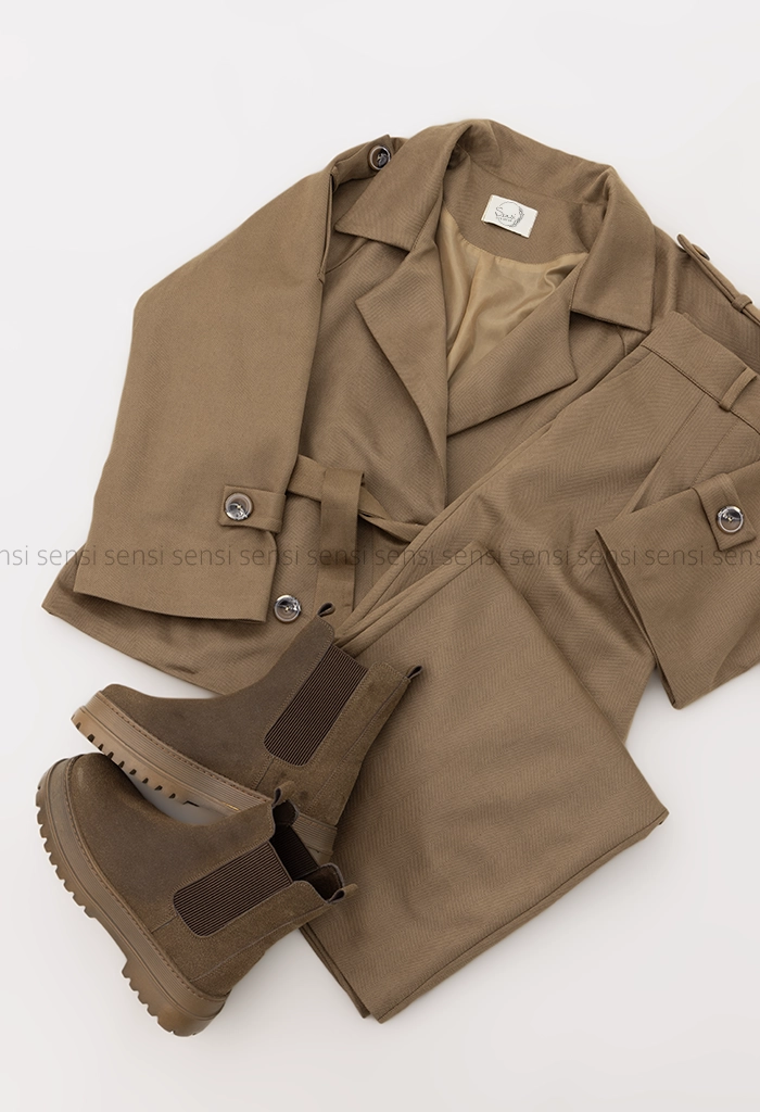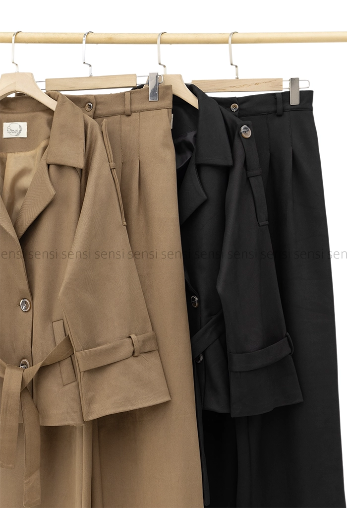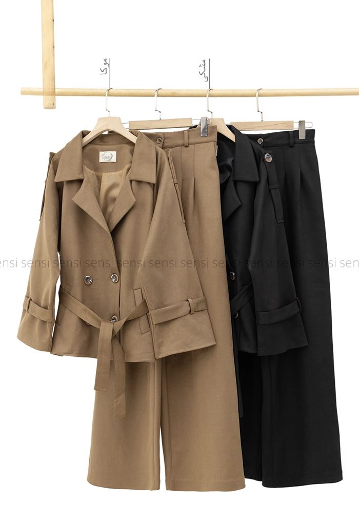 | نحوه بسته شدن | 2عدد دکمه جلوی کت/1عدد کمربند دور کمر کت/1عدد دکمه روی شلوار/17سانت زیپ روی شلوار |